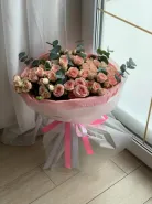 Букет из розовых кустовых роз с эвкалиптом